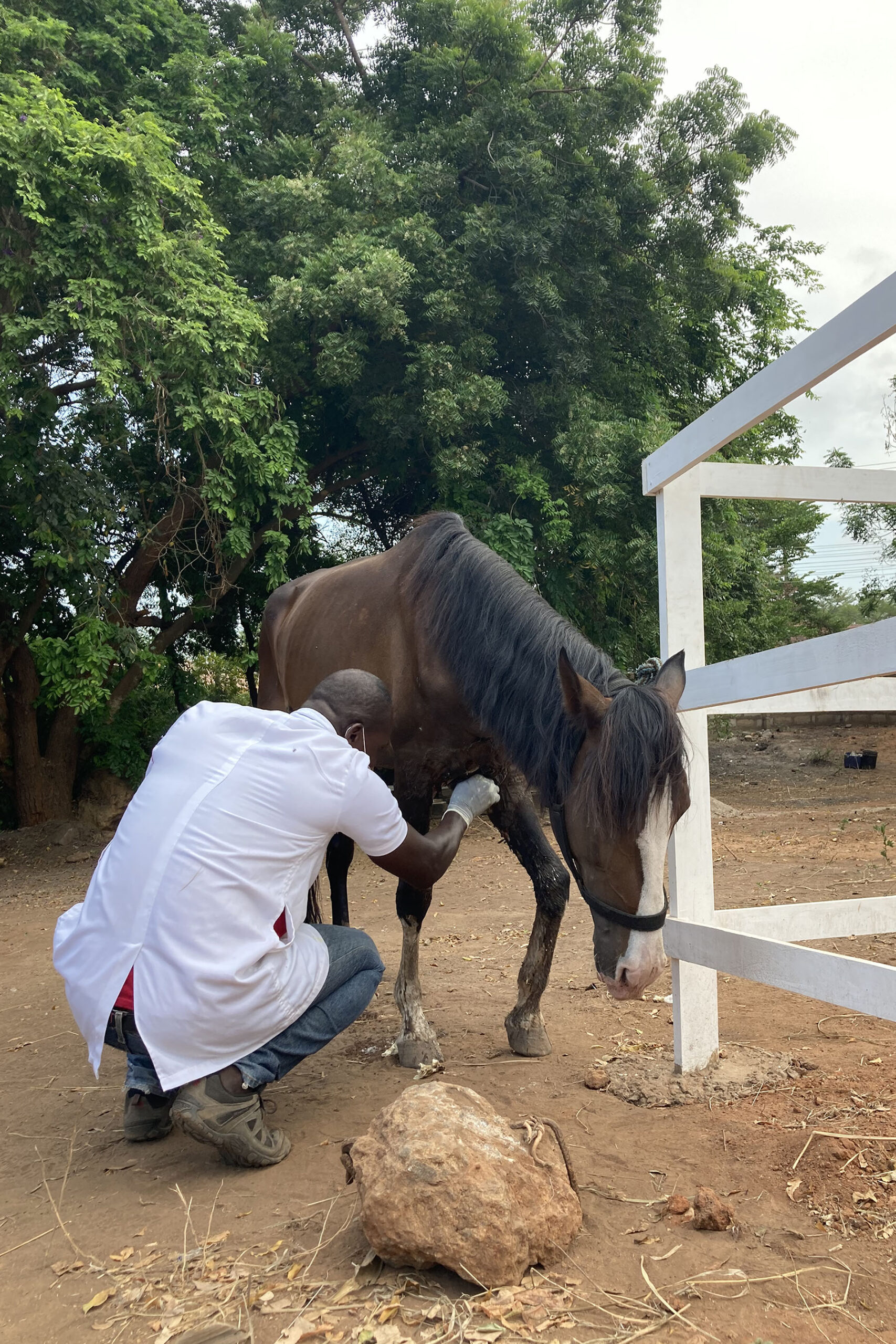 She immediately began calling every veterinarian she knew. Only Dr. Enoch Obeng answered and agreed to come. Mr. Key received first aid at his former stable in Accra, but within days, it became clear that proper care wasn’t being given. Again, the owner encouraged Ulla to take over completely. When she called our team in Akim Asafo, the answer was immediate: “You can come.”